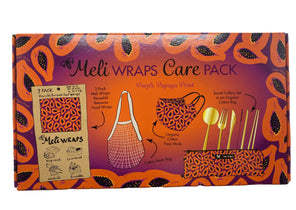 Each Care Pack comes with a matching set of: 3 Pack Meli Wraps Beeswax Wraps, an Organic Cotton Reusable Face Mask, a Travel Cutlery Set, and a Cotton Shopping Bag